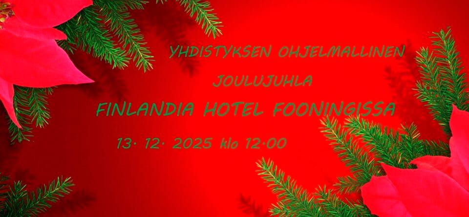 Kokoonnutaan viettämään yhdistyksen ohjelmallista joulujuhlaa 13.12.2025 klo 12.00 alkaen Finlandia Hotel Fooninkiin os. Kaarretie 4, 60150 Hyllykallio.